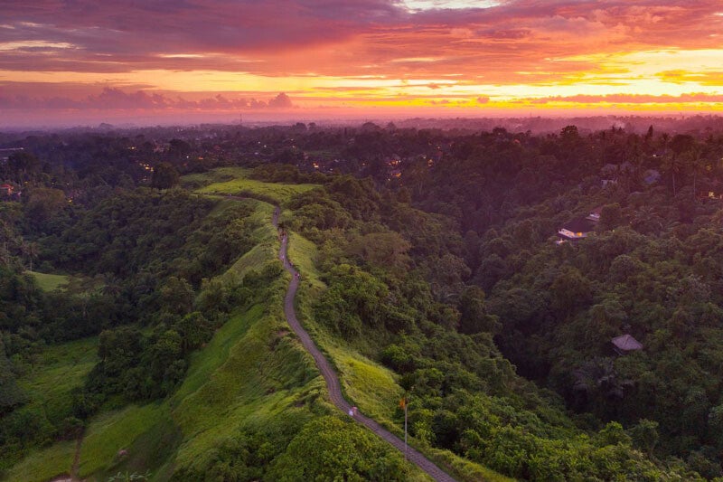 If you’re after something quieter than clifftops and temple crowds, Ubud´s Campuhan Ridge Walk is the golden-hour escape you’re after. This gentle nature trail snakes between jungle hills and rice paddies, offering open skies and soft evening breezes. As the sun drops, the entire valley changes color scheme, as a shadow play of coconut palms and dusky green grass sways against the peach and purple sky.