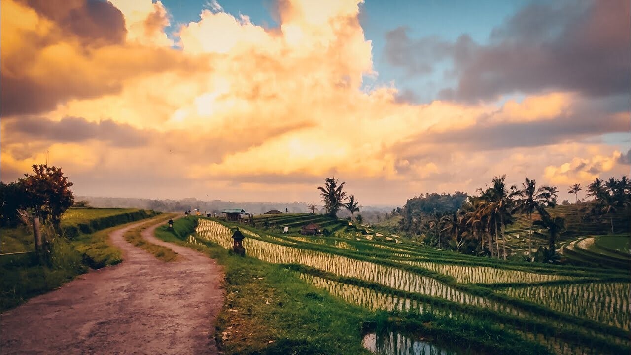 Set high in the Tabanan hills, the Jatiluwih Rice Terraces offer a different kind of Bali sunset — one painted across waterlogged paddies, jungle ridges, and misty slopes. As the atmosphere turns to mood light, the rice fields radiate every hue of deep gold and emerald green.